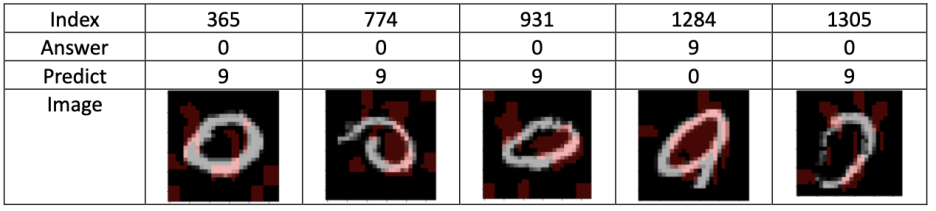 - 5개의 항목에 대해 이미지 확인 및 LIME으로 Positive 역할을 한 부분을 표시해서 함께 보면, 정답이 9이나 0으로 분류한 경우, 동그라미 부분은 인지했으나, 꼬리 부분을 인지하지 못해 0으로 오분류 한 것을 확인. 필터의 크기와 패딩에 변화를 주며 개선 가능
