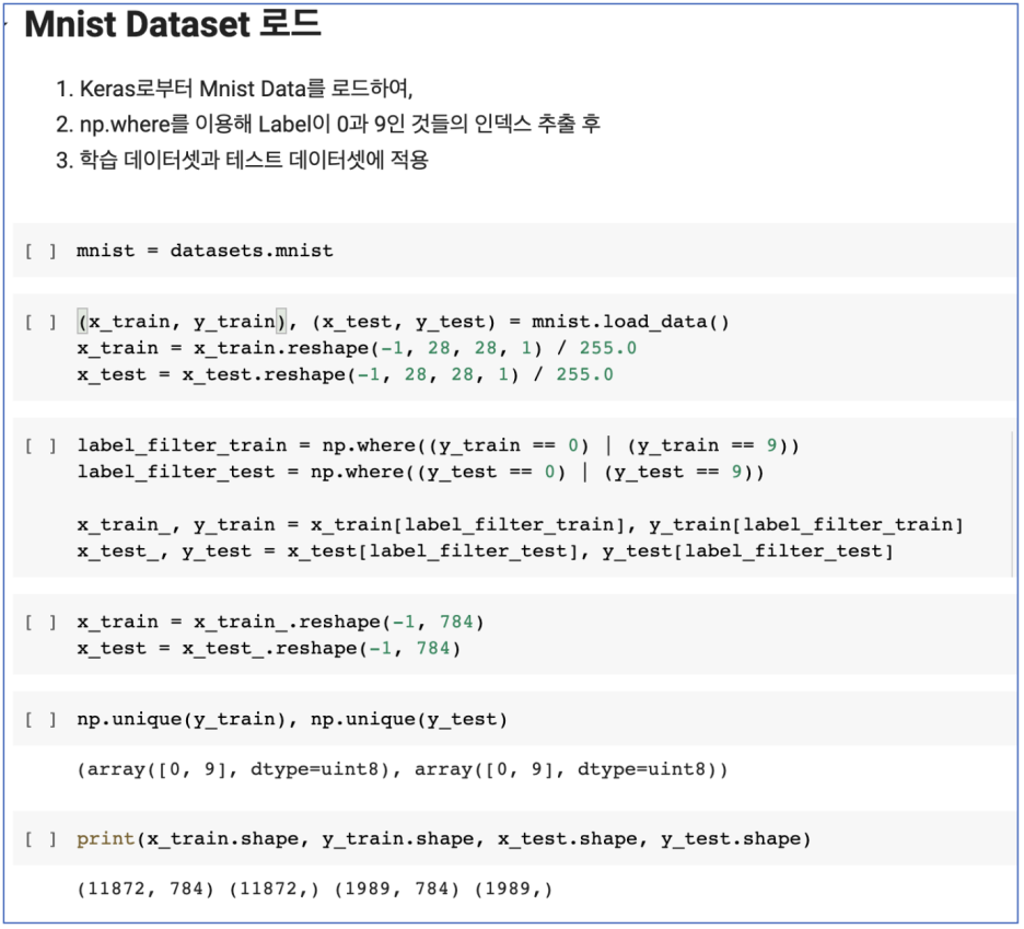 - np.where 를 이용해 Label이 0과 9인 항목의 인덱스 추출