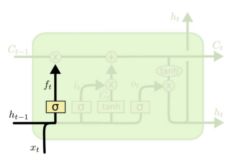 첫번째는 앞에서 넘어온 Cell state를 얼마나 버릴지를 결정하는 forget gate 입니다. 현재상태에서 들어온 input 값과 앞에서 넘어온 정보의 조합은 sigmoid 함수를 통과한 후 Cell state에 곱해주게 됨으로써 정보량을 완전히 버리거나, 완전히 들고갈 수 있습니다.