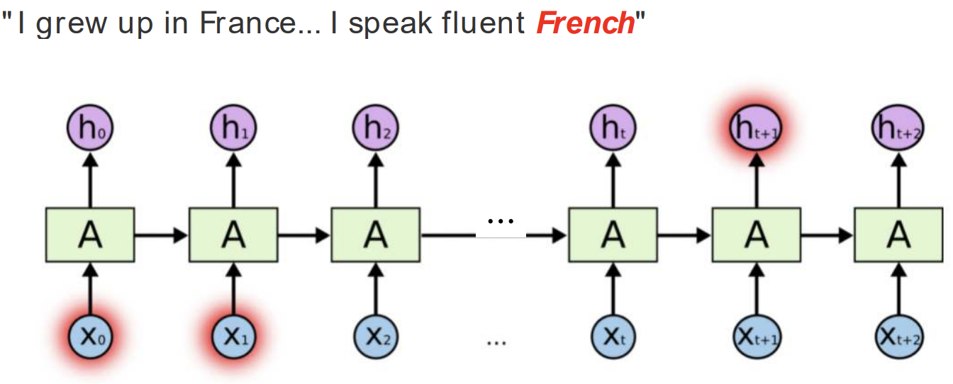 하지만, 데이터의 길이가 길어질수록 Vanishing 문제가 발생하여 (반복된 연산으로 데이터 끝단에서는 그 정보량이 희미해집니다.) 장기간의 패턴을 학습할 수 없다는 문제가 있습니다. 예를들어서, 아래 그림 왼쪽에서와 같이 비교적 짧은 문장에서는 RNN이 잘 작동하지만, 오른쪽과 같이 문장이 길어지고 예측해야 할 단어와 근거가 되는 단