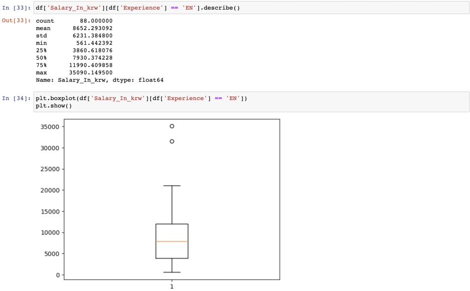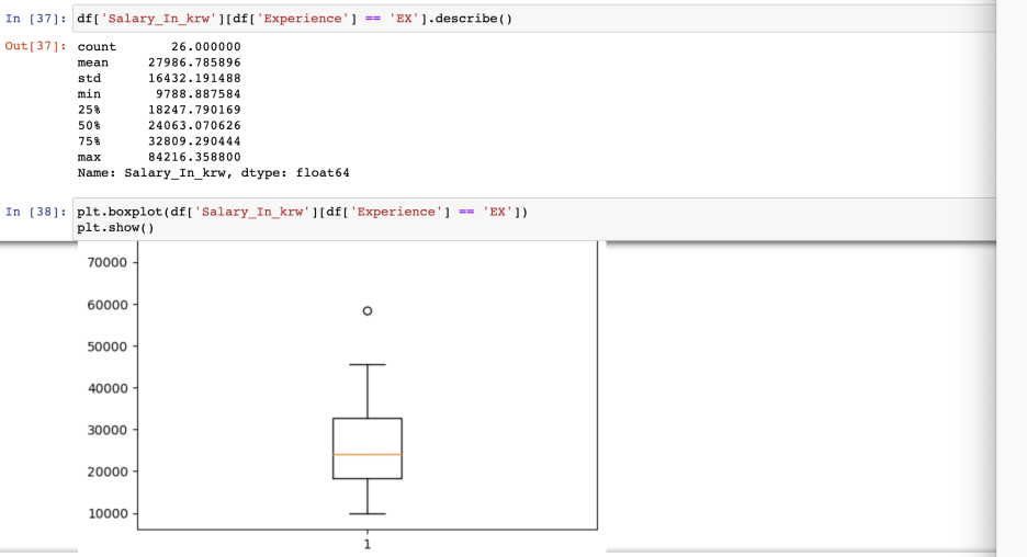 샐러리는 루피로 되어 있어, 환율을 곱하고 단위를 만원으로 조정하고자 10000으로 나눠주었다. 샐러리의 평균과 최소, 최댓값을 보니 호우...