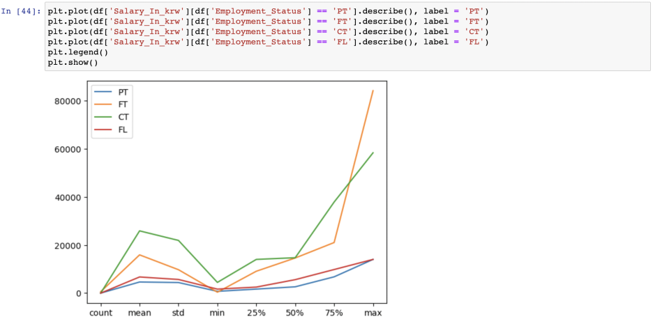 고용형태별로 연봉을 보면, 역시 계약단위의 고용이 제일 연봉이 좋다. 그 뒤로는 정규직이고 프리랜서는 생각보다 적었다. 능력이 좋아서 프리랜서를 하는것이 아닌가?