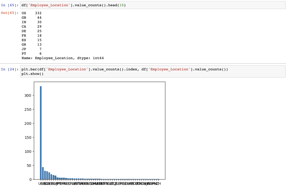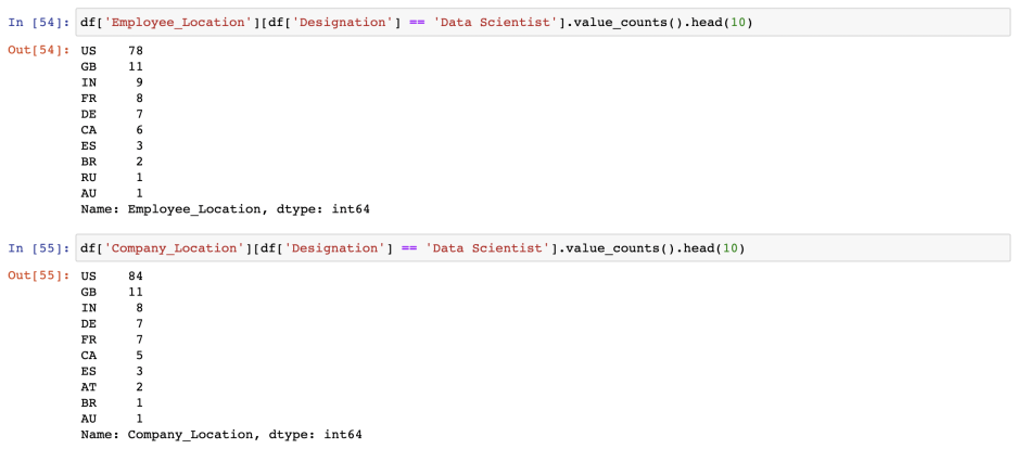 Data Scientist 직무를 갖고 있는 사람들과 회사의 지역을 살펴보면, 미국, 영국, 인도 순으로 나아간다.