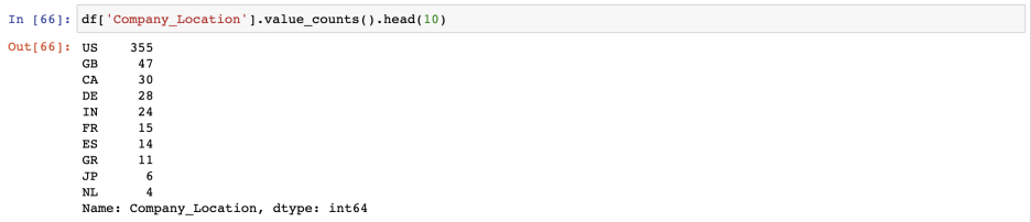 이어서 회사가 위치해 있는 지역을 살펴 보았다. 직원들의 위치와 크게 다르지는 않았다. 역시 미국과 영국. 그리고 캐나다. 캐나다의 토론토 대학교가 머신러닝 이쪽으로 리딩하고 있다고 들었는데 그래서인지 은근 많다.