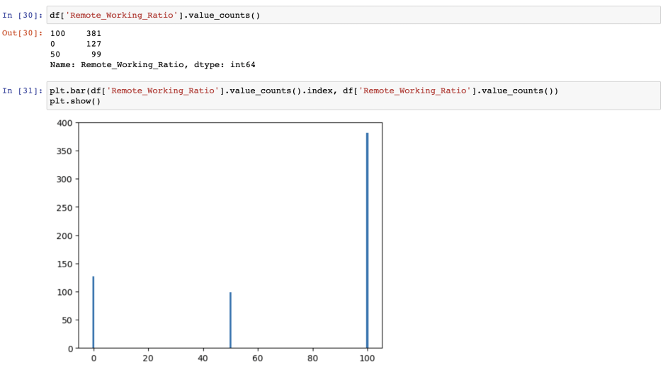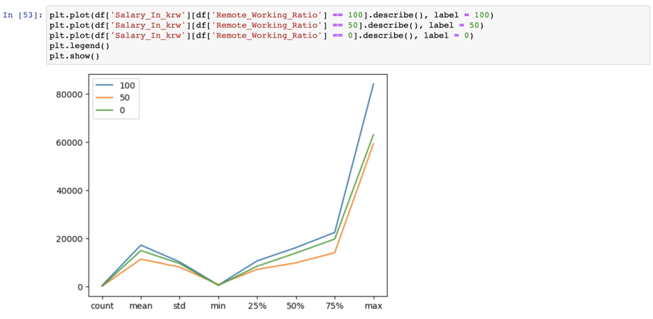 근무 형태를 (재택근무비율)을 살펴보면, 역시 회사에 굳이 나갈 필요가 없는 직무다 보니, 100프로 재택하는 종사자들이 많았다. 이렇게 재밌는 작업을 하면서, 연봉도 많이 받고, 재택근무를 하고, 거기에 정규직이라니.. ㄷㄷㄷ 가히 최고의 직업이지 않을까? 근데 또 출근을 하는 비율 역시 생각보다 많았다.