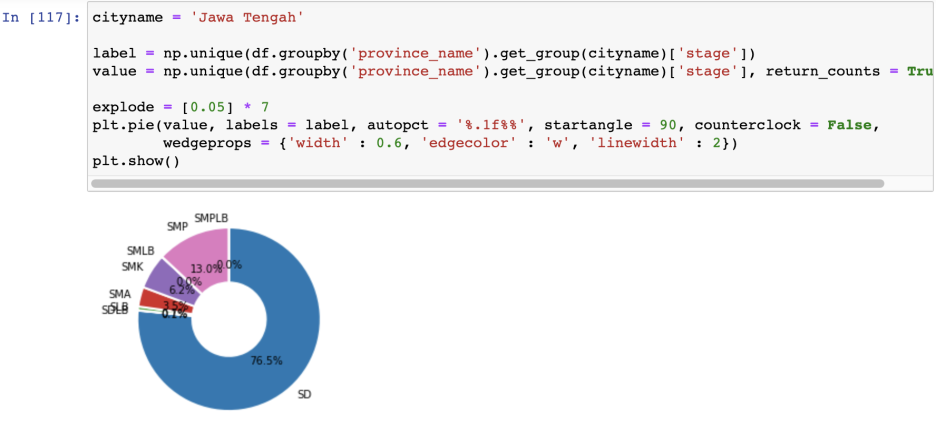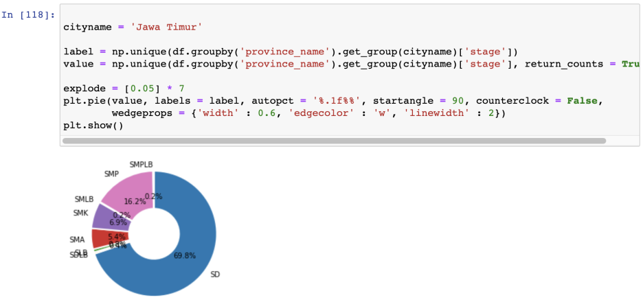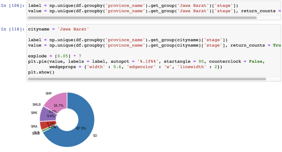 Status 컬럼은, N(공립), S(사립)을 의미하는 데이터로 기록되어 있다. 파이 그래프를 보면 알 수 있듯이, 공립의 경우 초등학교에 많은 비중이 몰려 있는 반면, 사립의 경우에는 Stage가 올라가도 비슷한 비율을 갖고 있는 것을 확인할 수 있었다. 사립 출신은 계속 사립을 통해 진학한다고 보면 될까? 인도네시아의 평균 학력이 어떻게 되는지는 모르겠지만 공립으로 초등학교를 나온 경우 학업을 계속적으로 이어나가지는 않다는 의미로 봐도 될까?