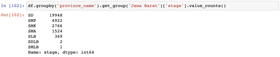 province_name 별로 학교의 수를 파악해 봤다. 특정 지방에서 압도적인 학교의 수가 몰려 있음을 확인할 수 있다. 아마도 이 지방에서의 인구 수 역시 많지 않을까 한다. 세군데의 province를 뽑아보자면, 'Jawa Barat', 'Jawa Tengah', 'Jawa Timur' 였다.